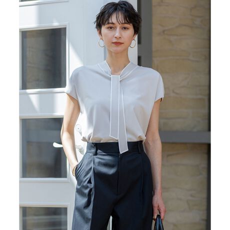 品良く着映えるボウタイデザインのニット。さらさらした素材感で、真夏の暑い時期にも快適に着用していただけます。透け感がほとんどないのでインナーを気にすることなく着られるのはうれしいポイント。気になる二の腕回りもカバーできる袖で、オフィススタイルにも取り入れやすいプルオーバーです。カラーは抜け感のあるライトグレー(#003)、ベーシックなブラック(#005)、やわらかな印象のベージュ(#033)の3色展開です。