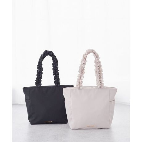 華やかなフリルハンドルとゴールドのブランドロゴが上品なトートバッグ。