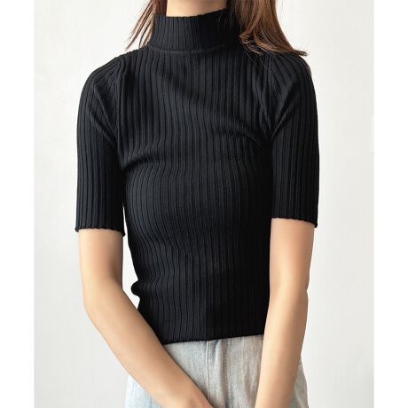 ・細リブが縦ラインを強調しすっきり見えする万能半袖ニットです♪