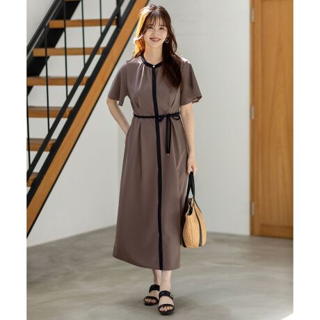 ・ボックスシルエットと、高い位置に施したウエストタックでスタイルアップ効果・共紐でウエストをマークすれば、フィット&フレアーなシルエットにもなる2WAYワンピース・フレアースリーブでさり気なく二の腕カバー・フロントゴールドボタンとリボン先端のメタルパーツが上品な印象