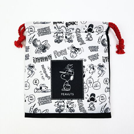 スヌーピーキャラのチラシ柄がカワイイ巾着です。メイク入れやコード類をまとめて入れるのに便利な大きさです。