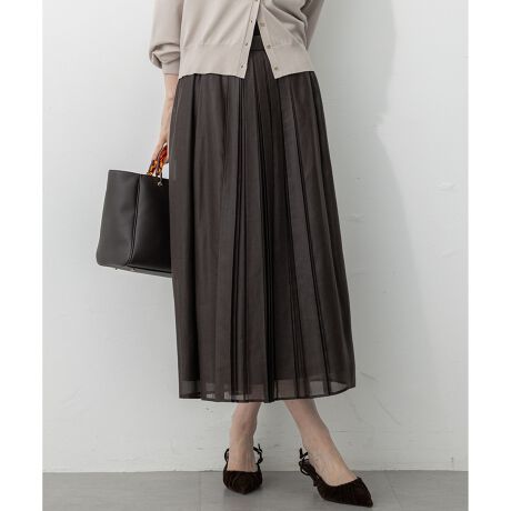 フロント部分に重なったプリーツを入れたタックスカート。贅沢な分量感と、フロントのデザインがポイントです。生地をたっぷりと使用していますがタックデザインで広がりすぎずに、スッキリと着ていただけます。カラーは、キャッチ―なライトオレンジ(#022)、上品な印象のベージュ(#033)、トレンド感のあるダークグリーン(#065)、こなれ感のあるダークブラウン(#035)の4色展開です。