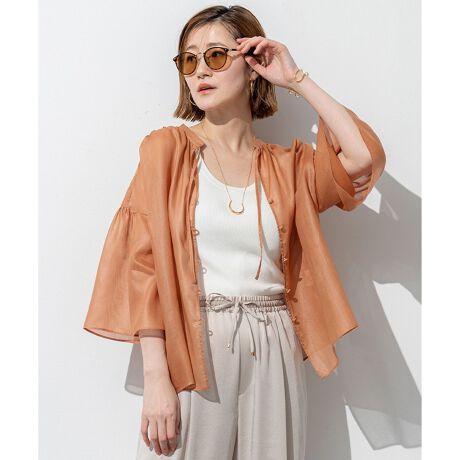 涼しげな生地感が目を惹く前後着用可能なデザインブラウスです。女性らしく見せつつも、甘くなりすぎないようにこだわりました。袖と身頃には程よいギャザーを入れ、分量感を出しているので、身体のラインを拾わずに着こなして頂けます。リボンを止めず、羽織としても着用できるので、さまざまなスタイリングをお楽しみいただけます。カラーは、キャッチ―なライトオレンジ(#022)、上品な印象のベージュ(#033)、トレンド感のあるダークグリーン(#065)、こなれ感のあるダークブラウン(#035)の4色展開です。