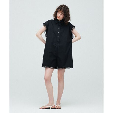 やや大きめな襟と太めの前立てディテールが魅力の、一枚で決まるシャツロンパース。