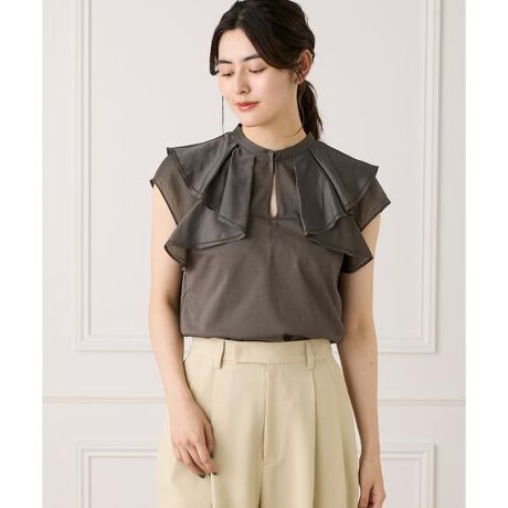 ■デザインラッフルカラーがポイントのジャージドッキングブラウス。 首元のフリルは袖に配したラッフルスリーブへ自然に流れるようにデザインされており、動く度に揺れる姿がフェミニティ溢れる一着です。前中心にスリットが入っているので、着脱もしやすい仕様になっています。■素材ピコミシンを施した透け感のあるオーガンジー素材を使用。表面シルケット加工により綺麗な光沢感と、緊密な組織になり、シワになりにくいジャージ素材です。また上質な綿素材で着心地が良く、吸湿性が高いです。・水洗い可■サンプル撮影商品■こちらの商品はサンプルでの撮影となっております。実際の商品とは、サイズや色味、素材、デザイン等の仕様が若干変更になる場合がございます。