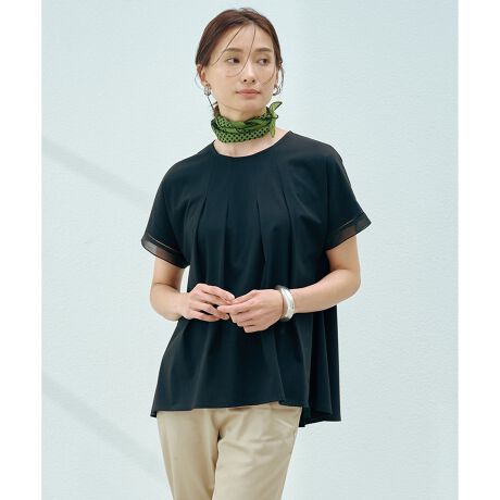■デザイン顔周りを華やかに見せる、襟元のタックが印象的なカットソー。裾に向かってふんわりと広がる、上品な光沢を纏った素材と計算されたシルエットにより、大人らしいすっきりとしたデザインに仕上げています。たっぷりと入ったタックが立体感を生み、1枚でも着映えするのが魅力。袖口には繊細なレースとほんのり透けるシアー素材を組み合わせ、軽やかさと涼しげな1着です。お尻が隠れる安心の丈感で、細身パンツとも好相性。体型を気にせずさっと着られてきちんと見えが叶う、夏に頼れるアイテムです。カラーは明るくメリハリのあるホワイト(#001)、シーンレスに活躍する大人なブラック(#005)、コーデに明るさと華やかさを添えるマリーゴールド(#020)、柔らかく女性らしいグレージュ(#033)、上品で凛とした印象のスモーキーブルー(#072)の5色展開。