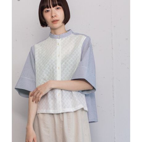 前身頃にエンブロイダリーレース生地を使用したシャツ。穴の開いたレース生地で涼しげな印象です。細めのスタンドカラーで甘さを控えてきちんと感を出しました。腕を華奢に見せてくれるひじ丈で、少し広がった袖と太めのカフスがポイント。オフホワイトとブラックは同色系、ブルーのウインドゥペンチェックはオフホワイトのエンブロイダリーとかけ合わせた爽やかな配色です。フルオープンで羽織りとしても着られます。