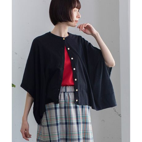 ケープのようなデザインカーディガン。抜け感のある短めの着丈に、たっぷりとしたリラックス感のあるシルエット。サイドの開きが気にならないよう袖下は綴じた仕様にしています。ボタンを留めてプルオーバーとしての着用もおすすめです。清涼感のある、軽くさらっとしたタッチのコットンで、シーズンの変わり目や冷房対策にもご活用いただけるアイテムです。