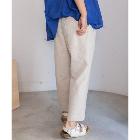 定番人気の鳥ポケットパンツ。ナチュラルな風合いのコットンキャンバスと通年着られるデニム生地を使用しました。ウエストはゴム仕様でリラックス感があり、裾にかけて細くしたペグトップのシルエットですっきりときれいに履けます。さりげないとり型のポケットがポイント。両サイドにポケット付き。