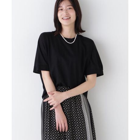 袖続きシルエットの5分袖プルオーバー。ゆったりした分量感が肌離れ感がありながら、裾で程よく落ち着く台形シルエットですっきりと着ることができます。