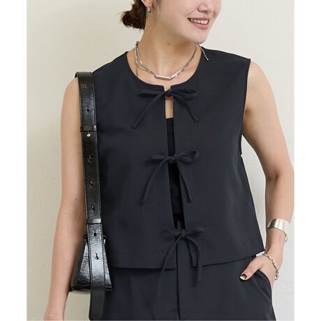 シンプルでコンパクトなノースリーブジレ。フロントがリボン仕様になっていて、TシャツやロンTに重ねるだけでデザインをプラスしてくれるトレンド感のあるプラスワンアイテムです。コンパクトなサイズ感でややとろみもある素材なので、インナーと合わせて夏場にはトップスとしても活躍します。デニムやカジュアルボトムと合わせてカジュアルにも、同素材のロングスカートとあわせてシックにこなして頂くのもおすすめです。