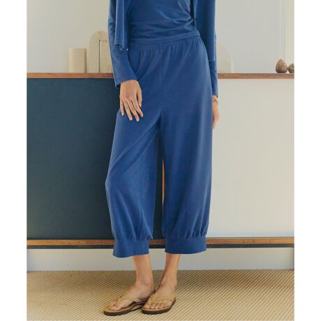 腰回りはすっきりとさせて、裾にギャザーを寄せたトレンドライクなハーレムパンツ型で、いつものスタイリングをアップデート。