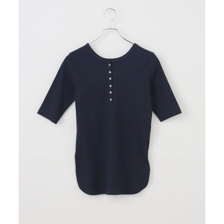 今年の気分で着れるすっきりとしたシルエットのヘンリーネックTシャツが登場!シャリみのある素材感でストレッチ性があってシャキっとしてきれいな素材。今シーズントレンドのギャザーやコクーンなどボリュームのあるボトムと相性がよいトップスです。