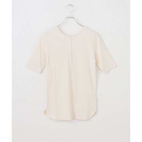 今年の気分で着れるすっきりとしたシルエットのヘンリーネックTシャツが登場!シャリみのある素材感でストレッチ性があってシャキっとしてきれいな素材。今シーズントレンドのギャザーやコクーンなどボリュームのあるボトムと相性がよいトップスです。