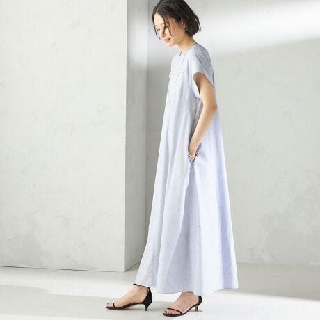 スキッパーネックで抜け感があり、裾にたっぷりボリュームを持たせたフレアシルエットのサマードレスです。