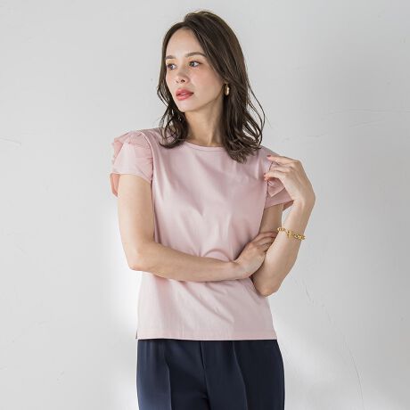袖にフリルを挟み込んだブラウスライクなカットソーです。