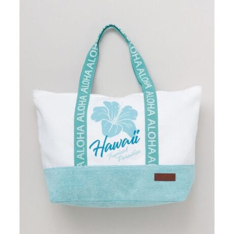 [型番:47SP5202-2025]パイル生地の大容量トートバッグ。中央のカラフルなハイビスカスがポイント。レジャーにもおすすめです。大きめな内ポケット付き。