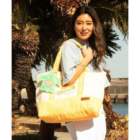 [型番:47SP5202-2025]パイル生地の大容量トートバッグ。中央のカラフルなハイビスカスがポイント。レジャーにもおすすめです。大きめな内ポケット付き。