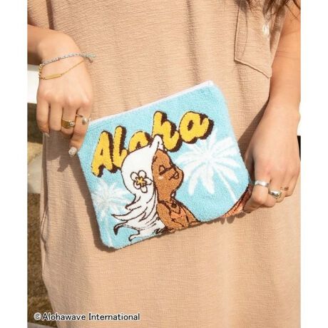 【Kahiko×Aloha Mapua】サーフィンとファッションをこよなく愛するキャラクター「Aloha Mapua (アロハマプア)」のサガラ刺しゅうポーチ。後ろの面もAlohaの文字が。モチーフのお花は、いつもマプアちゃんが頭に付けているプルメリアになっています。