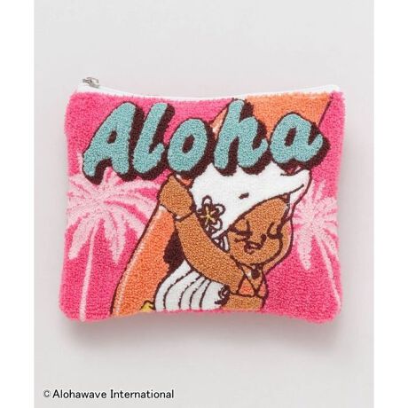 【Kahiko×Aloha Mapua】サーフィンとファッションをこよなく愛するキャラクター「Aloha Mapua (アロハマプア)」のサガラ刺しゅうポーチ。後ろの面もAlohaの文字が。モチーフのお花は、いつもマプアちゃんが頭に付けているプルメリアになっています。