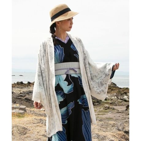 [型番:7CA-5203-2025]透け感が美しいカットジャカード素材の羽織。着物の上からでも着ていただける倭羽織型で、シンプルなインナーから柄物まで、様々なアイテムに合わせて着ていただけます。視覚からも涼しさを感じられる1枚です。