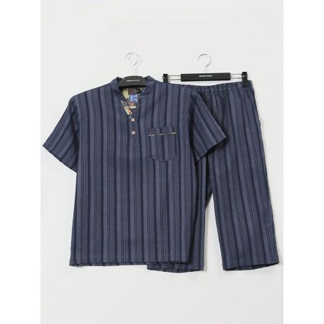 ヘンリーネックの半袖プルオーバーとステテコが2点セットになった、「和」をイメージしたをリラックスウェアです。凝りすぎないデザインで家中だけではなく、近所の買い物や散歩にも活用いただけます。