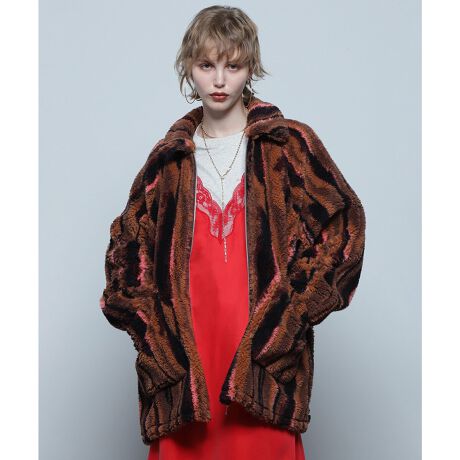 ヴィンテージライクな柄が目を惹くミドル丈のボアコート。