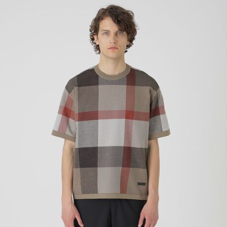 大柄のクレストブリッジチェックを前面にあしらったTシャツ。チェックはニットならではのメッシュ調ジャカード編みで表現することで、一般的なTシャツとは一味違う存在感ある見映えに作り上げています。ニットTシャツは上品な春夏の着こなしにこそ取り入れたいアイテムです。