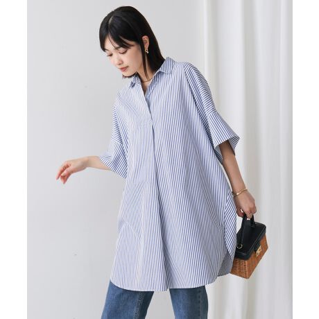 一枚着れば完成するスキッパーシャツチュニック。スキッパーデザインで首回りすっきりみえて、衿付きで首元の暑さや日焼けをカバー。