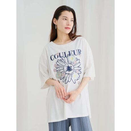 カラフルなフラワー刺繍を散りばめた着映えTシャツ。