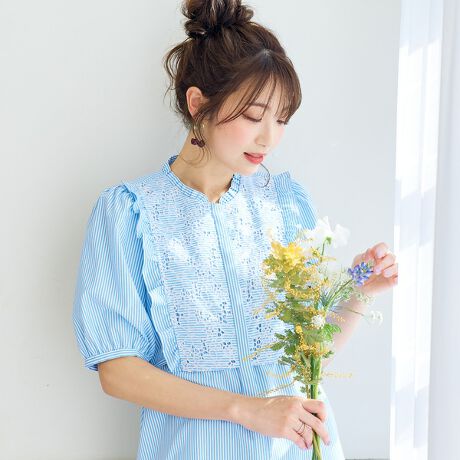 ストライプにアイレット刺繍が夏らしいブラウス。