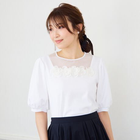 夏のカットソースタイルが一枚で可愛くなる、ボリューム袖と立体的なフラワーモチーフが大人なデザイン。
