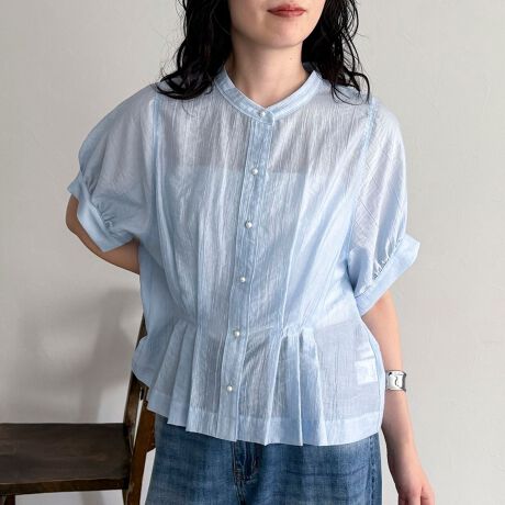 ・見た目にも涼し気なシアー素材で前開きで羽織にもなるデザインブラウスです