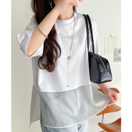 春夏に涼しさ引き立てる透け感が◎裾シアー切り替えライトダンボール半袖Tシャツ