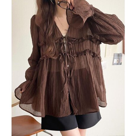 ふんわりとしたシルエットを引き立てるシアー素材のブラウス。