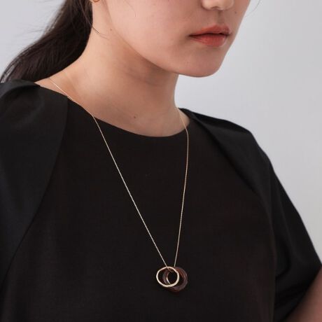 異なる3種類のパーツを組み合わせたリングデザインが、動きのある印象を与えるロングネックレス。