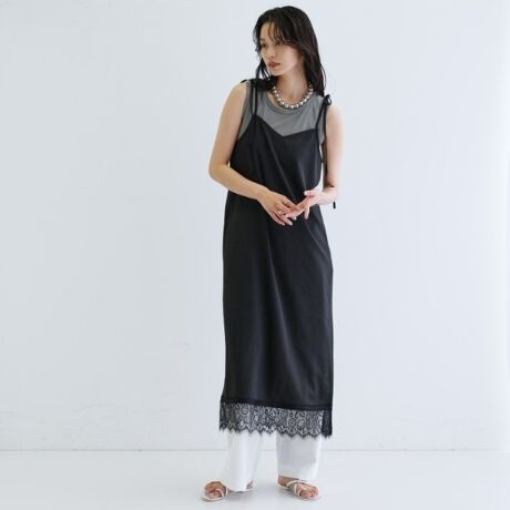 エレガントなレースタックが施されたキャミワンピースは、華やかさとリラクシーな印象を併せ持つアイテム。