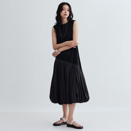 ジャージ素材の上身頃と、軽やかなファブリックの裾が絶妙に組み合わさったバルーンデザインのワンピース。