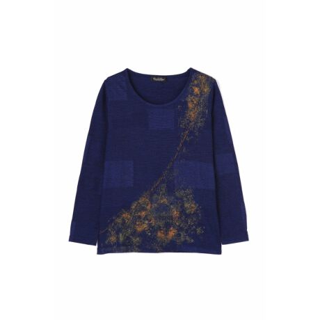 【DESIGN】パッチワーク柄のカスリリンクスジャージーを使用したプリントTシャツ。ビビットカラーのプリントが、よりトルネードの世界観を作り出しています。斜めに入った刺繍は、タコ糸と呼ばれる太番手の糸を通しており、プリントを立体的に見せています。【TEXTILE】カスリ糸を使用し、複雑な色味で表現したリンクスジャージー素材。パッチワークされたような柄感で、表面の凹凸感が美しい素材感となっています。