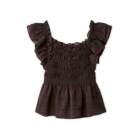 FRAY I.D定番のシャーリングトップスを、夏らしく華やかな印象にグレードアップ。