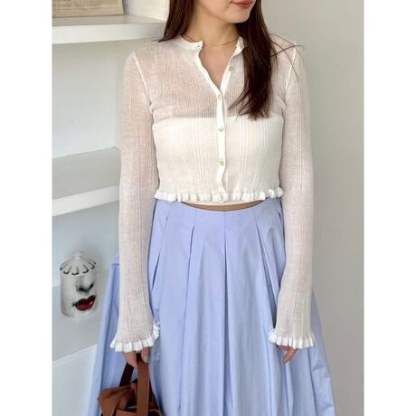 光沢糸がミックスされた、繊細な糸で仕立てたカーディガンです。