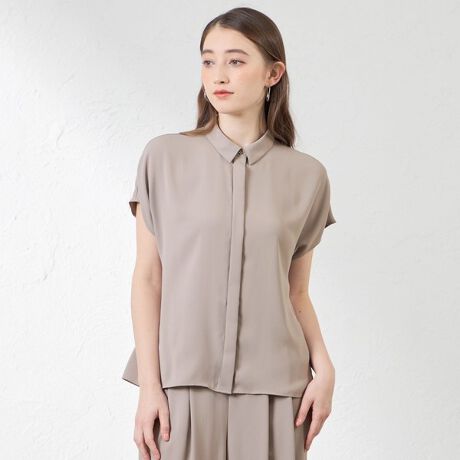 衿付きの前あきブラウスです。第一釦には繊細なフラワーモチーフの釦をアクセントにし、前立ては略比翼ですっきり見えるようにデザインしました。 ボディはややゆったりめでからだのラインを拾いにくく、リラックス感がありながらもきれいに見えるシルエットに仕上げました。 落ち感のある素材でフレンチスリーブが上品な雰囲気ながらも涼やかに着ていただけます。
