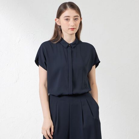 衿付きの前あきブラウスです。第一釦には繊細なフラワーモチーフの釦をアクセントにし、前立ては略比翼ですっきり見えるようにデザインしました。 ボディはややゆったりめでからだのラインを拾いにくく、リラックス感がありながらもきれいに見えるシルエットに仕上げました。 落ち感のある素材でフレンチスリーブが上品な雰囲気ながらも涼やかに着ていただけます。
