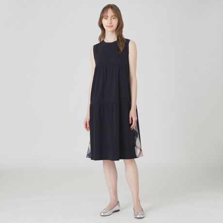 [型番:55J36558__]◆クレストブリッジチェック切替がポイントのティアードドレス【Design】程よいティアードが大人可愛いデザインジャージドレスです。気になるおなか回りを優しくカバーしてくれるシルエットです。足元次第で、リゾートからタウンのデイリー使いなど、様々なシーンに活躍します。【Fabric】本体:接触冷感、吸水速乾、UV、抗菌防臭機能を備えた素材です。