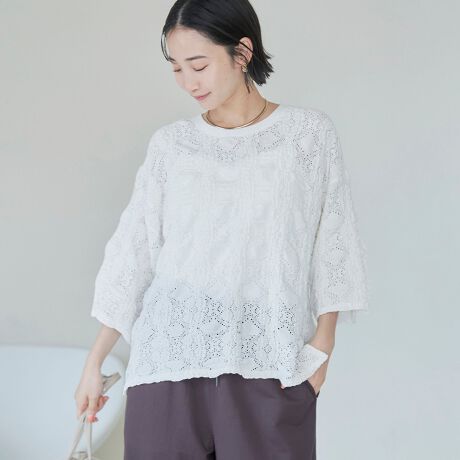 遠目にはケーブルニットにも見える、独特の凹凸感のあるレース風の素材を使用。