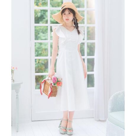 クラシカルなデザインが大人可愛い印象を与える、上品なラッフルスリーブワンピース【Design】・Vネックとフロントボタンのクラシカルなデザインが、上品で女性らしい印象を与えるワンピース。・ナチュラルな風合いの生地が優しい雰囲気を演出し、軽やかな着心地を提供します!・高い位置で切り替えられたウエストラインが、ウエスト位置を高く見せてくれる効果◎・裾に向かって広がるフレアシルエットが、ウエストを細見えさせて、スタイルアップをサポートします。・後ろのウエスト部分に施されたリボンが可愛らしさをプラスし、後ろ姿も素敵に演出♪・ゴム仕様の背中部分は伸縮性があり、リボンでサイズ感の調整も可能です。・背中ファスナー仕様。【Fabric】・ナチュラルな風合いの生地を使用。・ご自宅でお手入れが出来るのも嬉しいポイント♪・ホワイト、インディゴ、ギンガムチェックの3色展開となります。【Care】手洗い可能