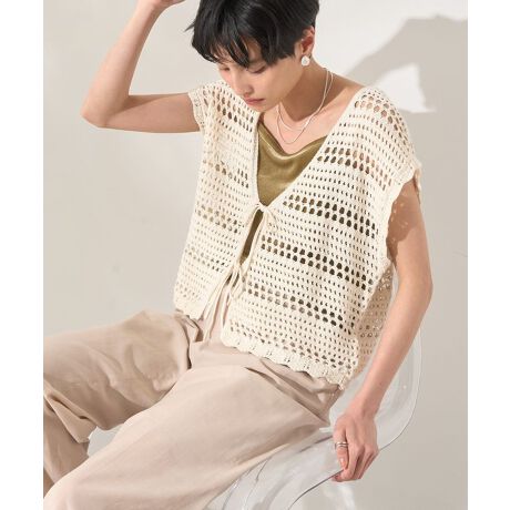 レーシーな編みディテールがスタイリングのアクセントに最適なニットジレ。幅のあるゆったりとしたシルエットでサラッと羽織っていただける手軽さも嬉しいデザインです。Vフロントにはダブルのリボン紐でほんのりフェミニンな甘さをプラス。いつものスタイリングにオンするだけで柔らかい印象に変えてくれる着回し力の高いアイテムです。透け感[あり]