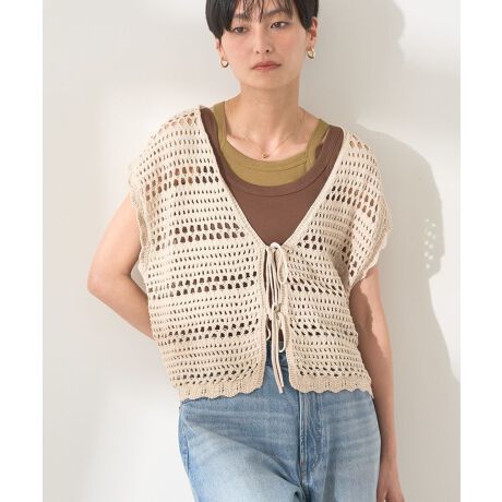 レーシーな編みディテールがスタイリングのアクセントに最適なニットジレ。幅のあるゆったりとしたシルエットでサラッと羽織っていただける手軽さも嬉しいデザインです。Vフロントにはダブルのリボン紐でほんのりフェミニンな甘さをプラス。いつものスタイリングにオンするだけで柔らかい印象に変えてくれる着回し力の高いアイテムです。透け感[あり]