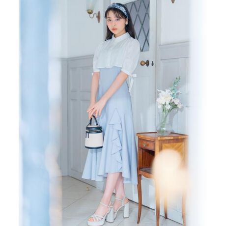 着回し自在な大人フェミニンコーデが完成するふんわりブラウスとラッフルワンピの2点セット【Design】・クロップド丈ブラウスとフリルキャミワンピースが2点セットになった、着回し力抜群のフェミニンセットアップ。・ブラウスはパールボタンとパフスリーブ、袖口のリボンが上品で華やかな印象を与えます♪・脚長効果のあるショート丈トップスは、スタイルアップを叶える嬉しいデザイン。・マーメイドライン風のヘムフレアがエレガントに揺れる、大人可愛いワンピーススタイル。・キャミワンピースは、ウエストシャーリングとレースアップ仕様で体型に合わせて美シルエットをキープ!・ワンピースのインナーとしても、上から羽織っても着られる2wayコーディネートが楽しめます。・Tシャツやシアートップスとのレイヤードもおすすめな、春夏のデート服やお出かけコーデにぴったり◎【Fabric】・ブラウスはさらりとした肌触りで、透け感のある生地を使用。・ワンピースは薄手で軽い着心地で、程よいハリ感のある裏地付き。・ホワイト、サックス、ネイビーの3色展開となります。【Care】ドライクリーニング