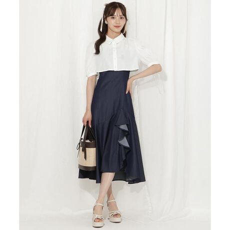 着回し自在な大人フェミニンコーデが完成するふんわりブラウスとラッフルワンピの2点セット【Design】・クロップド丈ブラウスとフリルキャミワンピースが2点セットになった、着回し力抜群のフェミニンセットアップ。・ブラウスはパールボタンとパフスリーブ、袖口のリボンが上品で華やかな印象を与えます♪・脚長効果のあるショート丈トップスは、スタイルアップを叶える嬉しいデザイン。・マーメイドライン風のヘムフレアがエレガントに揺れる、大人可愛いワンピーススタイル。・キャミワンピースは、ウエストシャーリングとレースアップ仕様で体型に合わせて美シルエットをキープ!・ワンピースのインナーとしても、上から羽織っても着られる2wayコーディネートが楽しめます。・Tシャツやシアートップスとのレイヤードもおすすめな、春夏のデート服やお出かけコーデにぴったり◎【Fabric】・ブラウスはさらりとした肌触りで、透け感のある生地を使用。・ワンピースは薄手で軽い着心地で、程よいハリ感のある裏地付き。・ホワイト、サックス、ネイビーの3色展開となります。【Care】ドライクリーニング